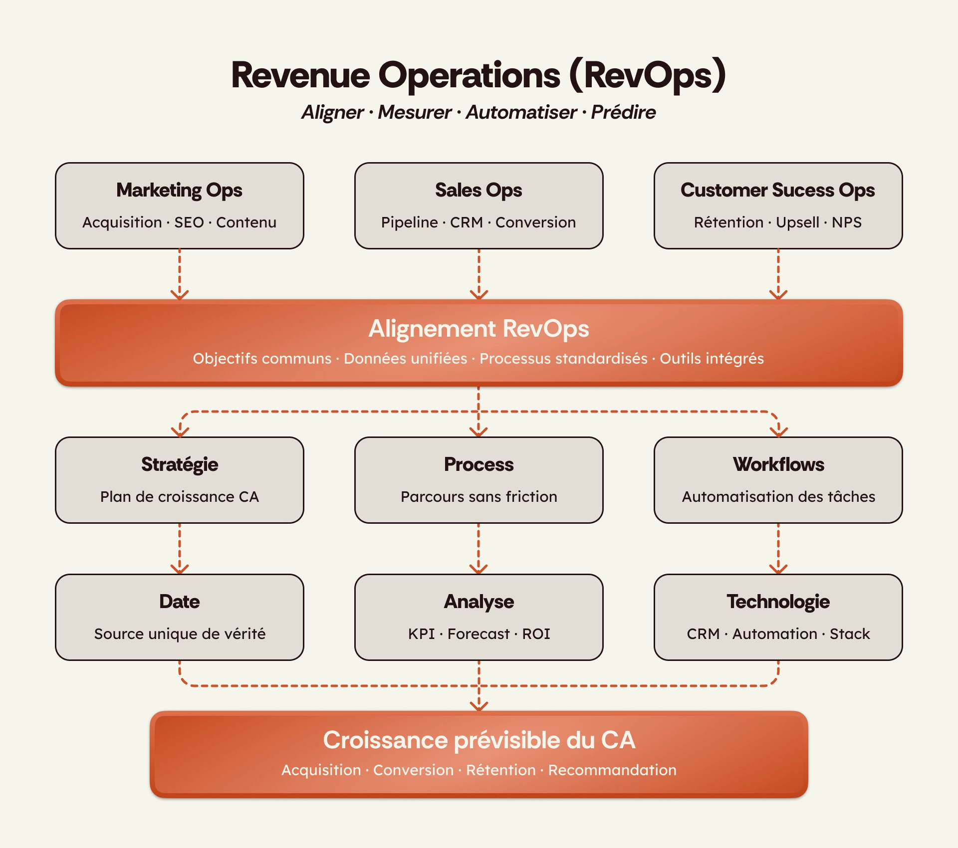 Là où les fonctions Ops sectorielles optimisent en silo, le RevOps crée un pont entre ces équipes pour que chaque action marketing nourrisse le pipeline Sales, et que chaque interaction Customer Success génère de la rétention et de l'expansion revenue.